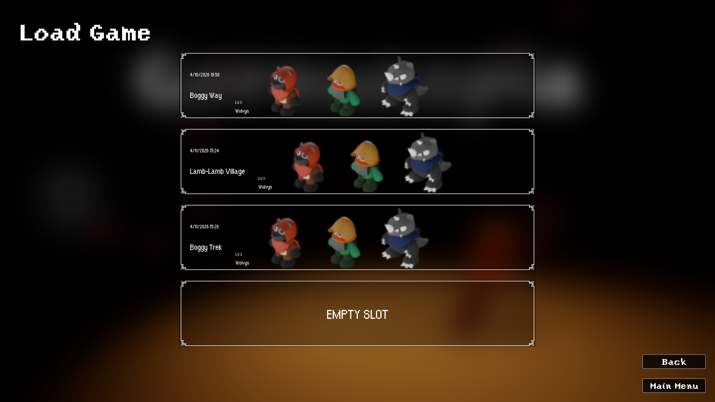 The menu and save interfaces were designed for efficiency and clarity, allowing players to navigate options and manage progress with minimal friction. Information is organized hierarchically, ensuring that essential actions. Saving, loading, and accessing inventory are intuitive, quick, and easy to access.