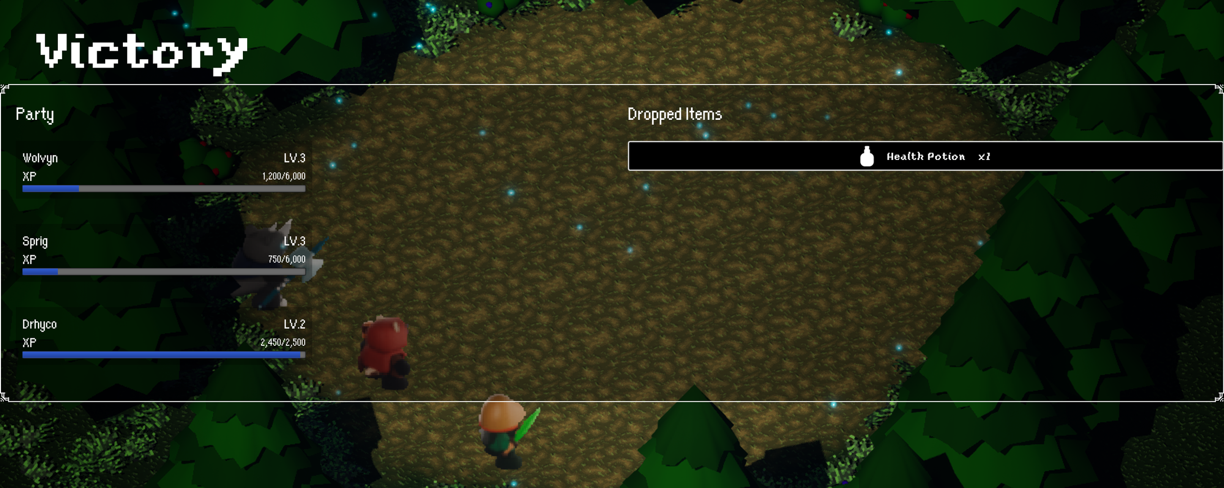 The results screen is designed to clearly communicate post-battle rewards through a balanced, two-column layout. On the left, party experience gains are displayed and updated in real time, allowing players to track progression and level growth at a glance. On the right, item drops are presented in a dedicated space, ensuring rewards are easy to identify without competing with progression information. This separation reinforces clarity and provides a satisfying, organized summary of the battle outcome.