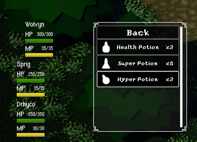 The player can acquire a wide variety of items over time. As a a result, the inventory interface was designed with scalability in mind. The item menu supports expansion without compromising readability, using a structured list layout paired with a vertical scroll bar to accommodate growing content. This approach ensures that as the player’s inventory evolves, the interface remains organized, easy to navigate, and consistent, preventing clutter while maintaining quick access to important items during gameplay.